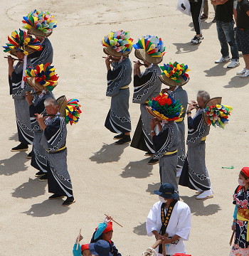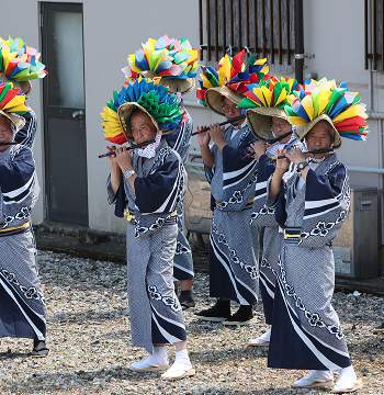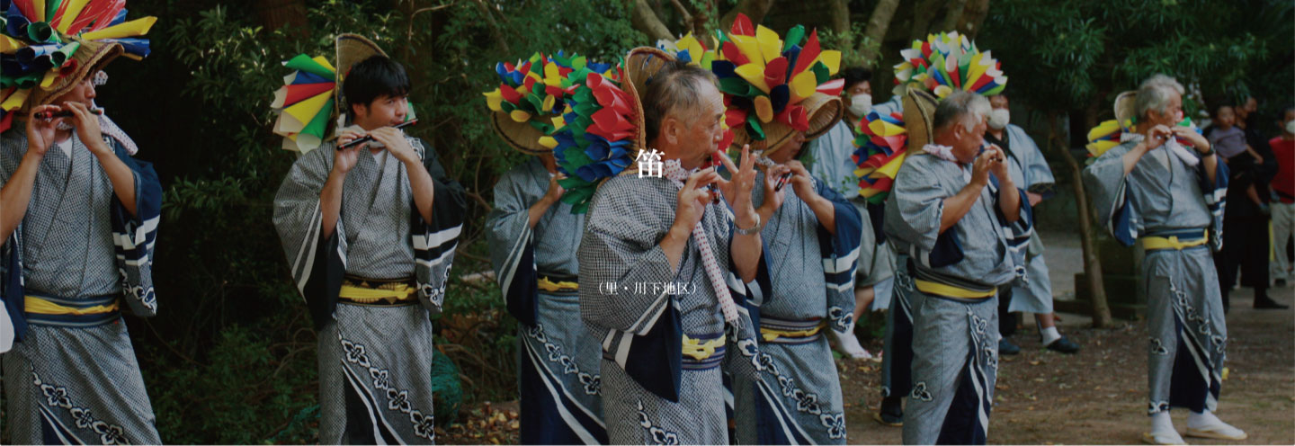笛(里・川下地区) 笛吹きの装束は、花笠に浴衣である。 笛は竹の横笛であるが、他地方のものに比べ高音で強い吹込みが必要だと言われています。 笛の曲目は「奉還道」「地」(大天月をかぶって打つ)「地みちびき」など十三曲がある。 庭場で掛け打ちが大太鼓とともに踊るのは地の曲であり、大太鼓を中心に踊るのは地みちびきである。