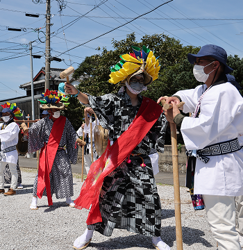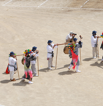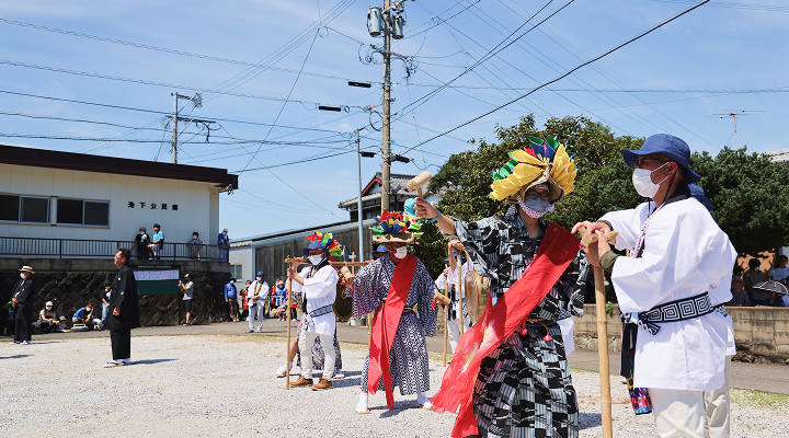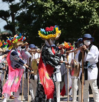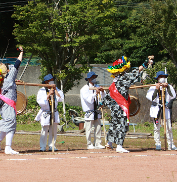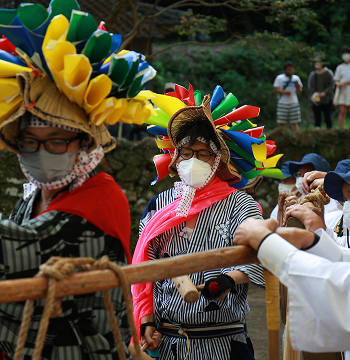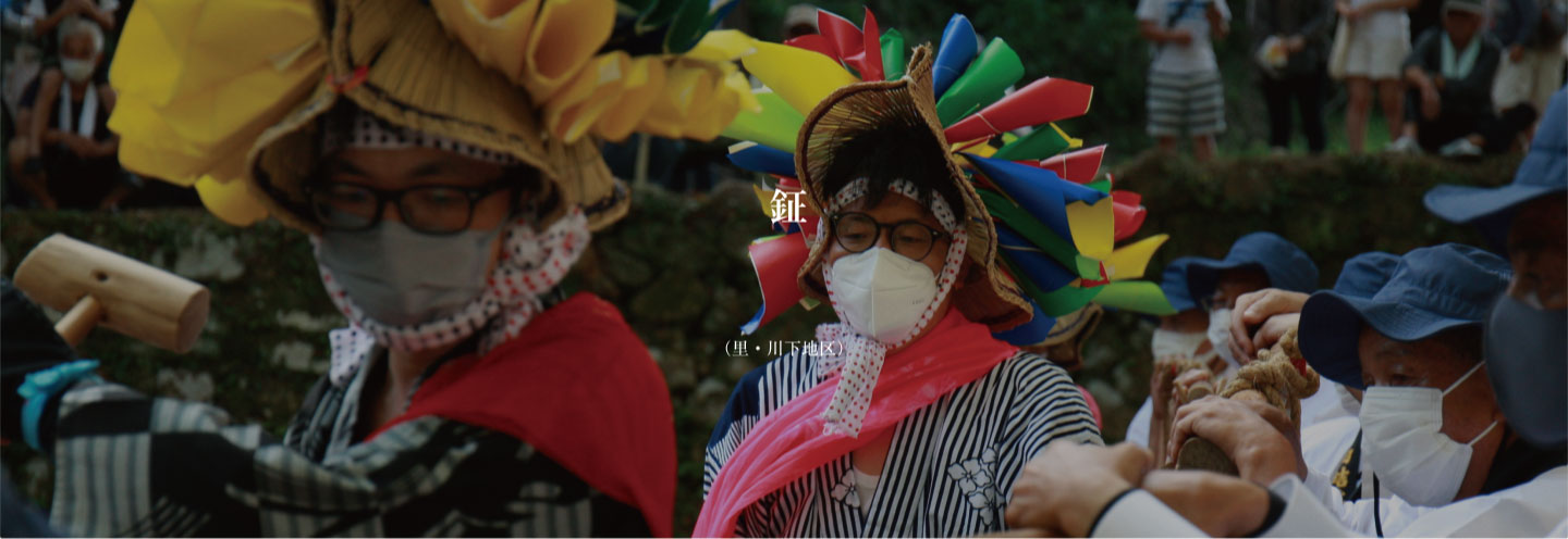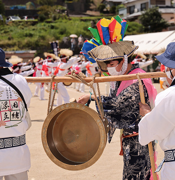 鉦(里・川下地区) 装束は花笠を被り、浴衣・角帯・色襷を背より垂らし、草鞋姿である。 田結浮立は、三番鉦であり、同型同音二人担いで、両手に木槌を持ち、天を仰ぎ地に伏す格好で、腰をかがめて足拍子・手拍子面しろく、笛の曲に合わせ三個の鉦を打ちならします。 浮立の音曲には片拍子と両拍子がありますが、田結浮立は太鼓と鉦を交互に打つ面拍子です。
